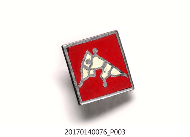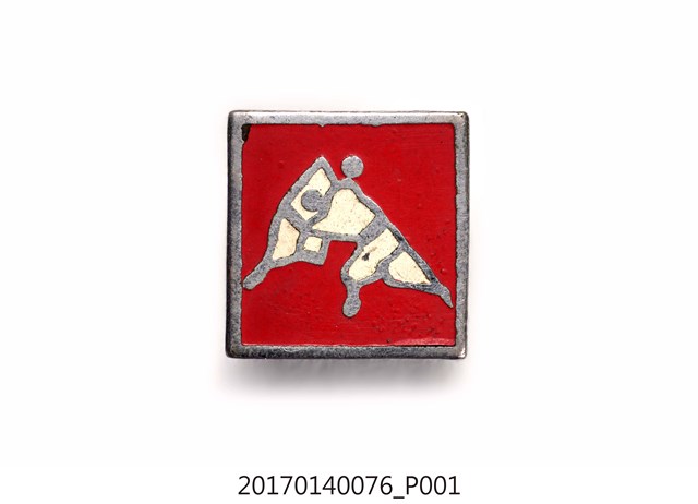 銀框紅色方形紀念章,中央有兩柔道選手對打圖案。