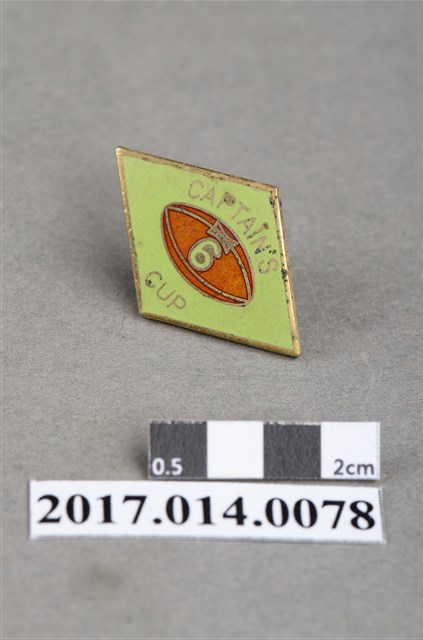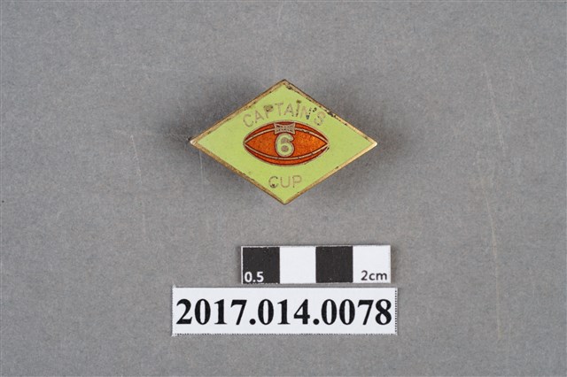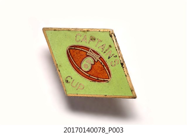 草綠色金框菱形徽章,中央有一褐色橄欖球圖案,橄欖球內有數字「6」字樣,球上下各有「CAPTAIN」、「CUP」金字。