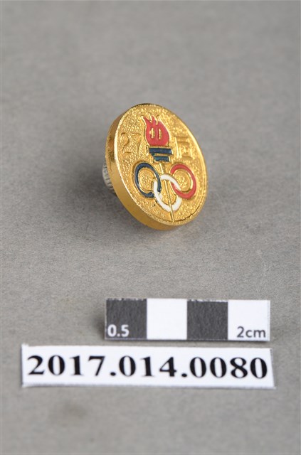 金色圓形紀念徽章,樁央有紅白黑塞三色環及火炬標誌,以及「27屆」字樣。
