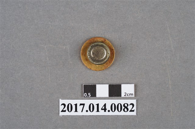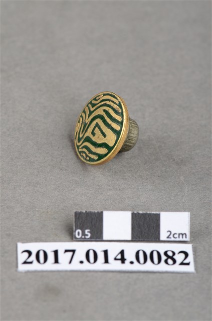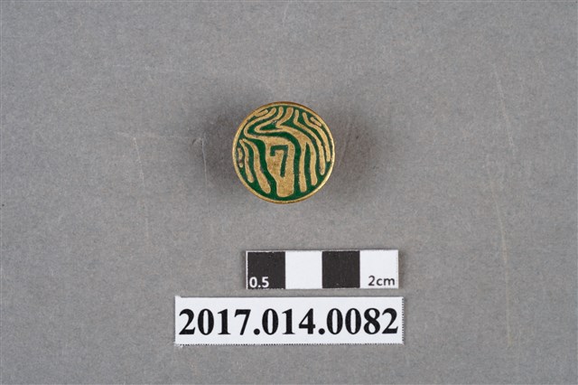 金綠色圓形紀念章,綠色底,中央有一數字「7」及金色粗細線條組成抽象幾何圖案。來源用途不明。