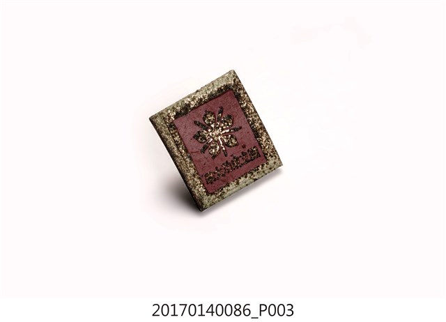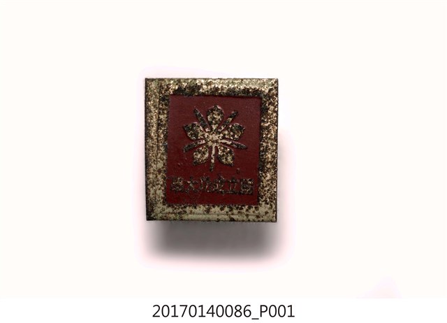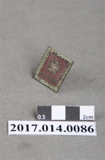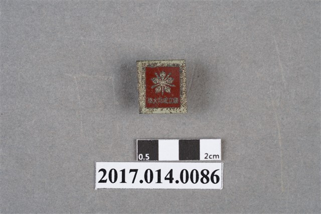 白框紅色方形國立成功大學紀念徽章,表面磨損,圖文已模糊,肉眼難以辨識。
