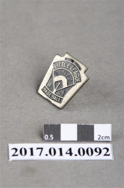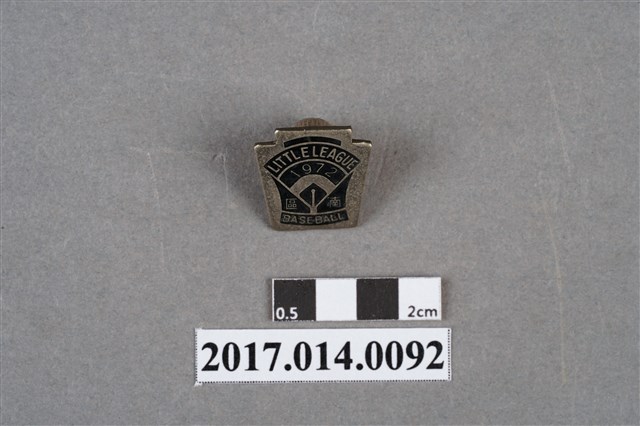 銀藍雙色長方形紀念章,中央有棒球球場形圖案,內外野有「LITTLE LEAGUE」、「1972」、「南區」、「BASEBALL」等字樣。