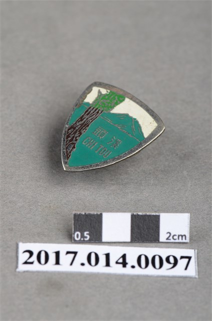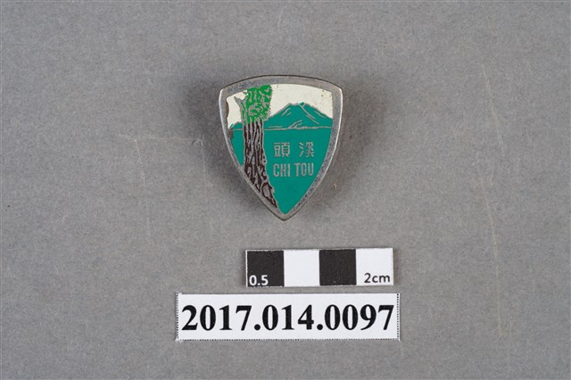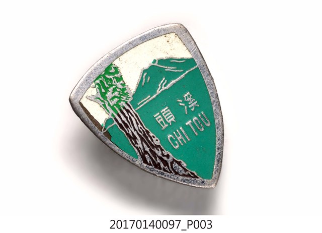 圓盾形綠白雙色紀念張,上有神木、山岳圖案及「溪頭 CHI TOU」字樣。