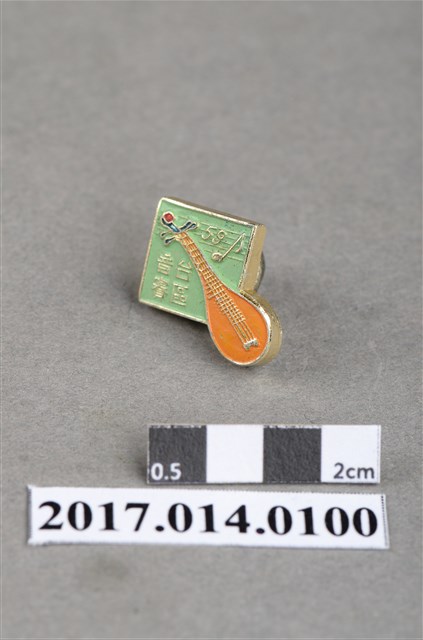 1. 民國59年臺灣區音樂比賽紀念章。綠色方塊及黃色琵琶形徽章,方塊區有「59」音符圖案及「台區音賽」字樣。