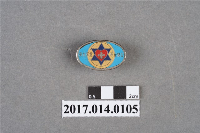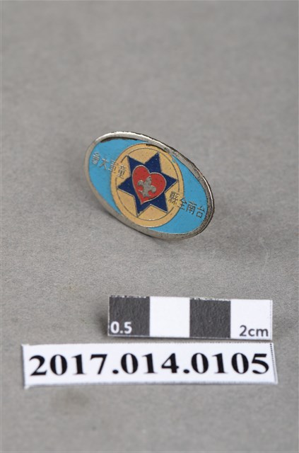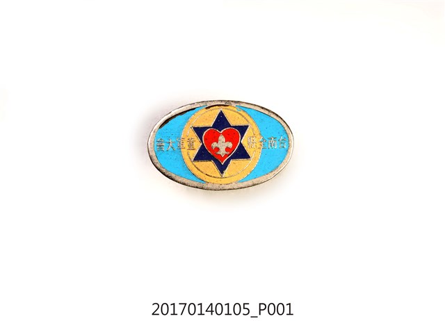 臺南縣童子軍大會紀念章,藍黃色橢圓形紀念章,中央有六角星型童軍徽,左右兩側有「台南全縣」、「童軍大會」浮凸字樣。
