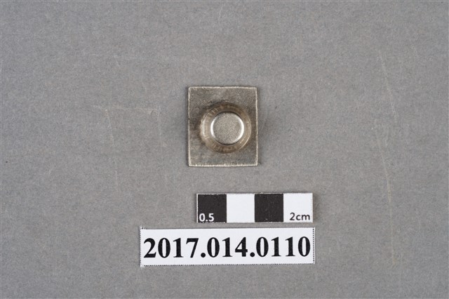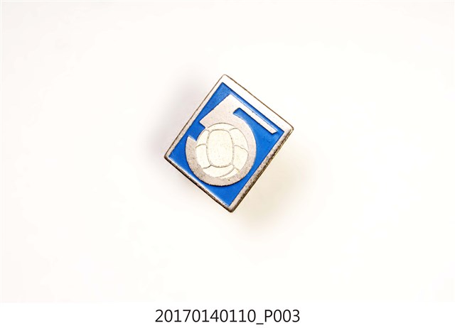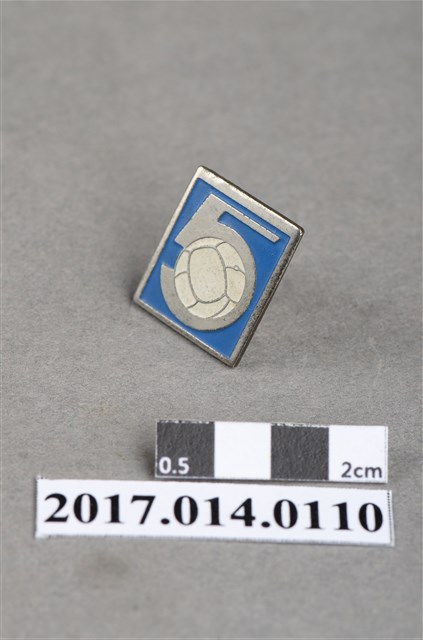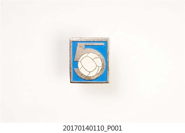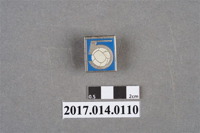 銀藍色正方形紀念章,中央有一球形圖案及「5」字樣,用途來源不明,推測為球類比賽紀念章