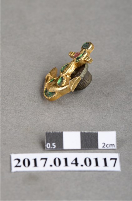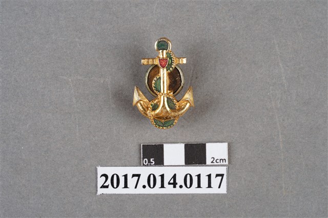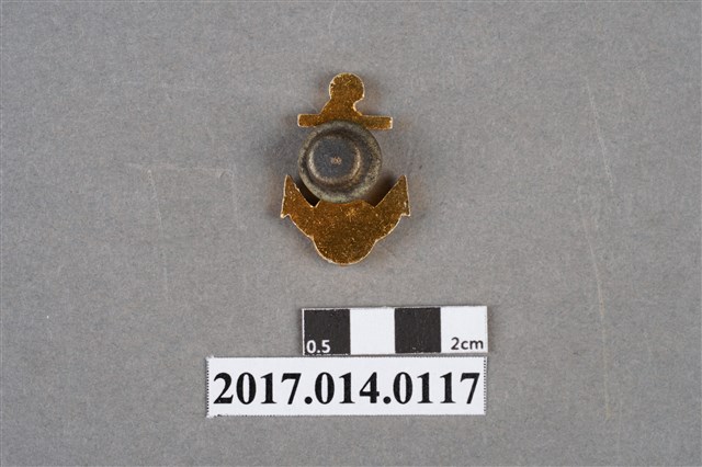 金色船錨型紀念徽章,上方有一紅點,船錨有纜繩纏繞狀。用途來源不明。
