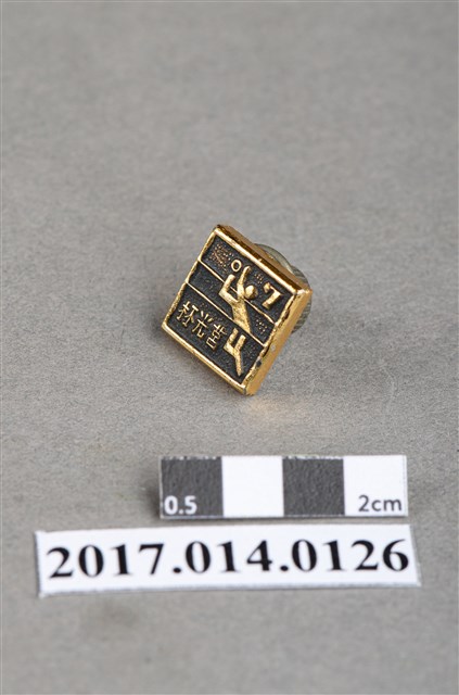金、黑雙色方形紀念章,中央有一水球員擲球圖案,四週有水波紋,左下腳有「莒光杯」金字。