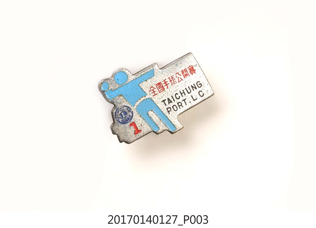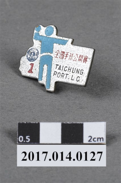 銀色長形紀念章,中央有一藍色手球員圖案,左側有獅子會標誌及紅色數字「1」,右側有「全國手球公開賽 TAICHUNG PORT. LC」紅、藍色字樣。