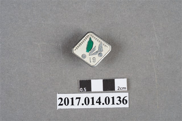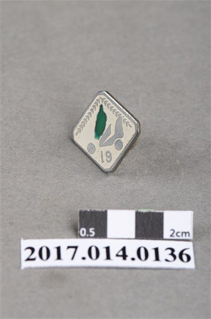 白色菱形紀念章,中央有一綠色臺灣島圖案,上方有數字「61」字樣,左側有一射擊者瞄準圓球標靶圖案。