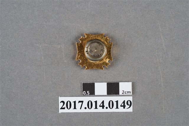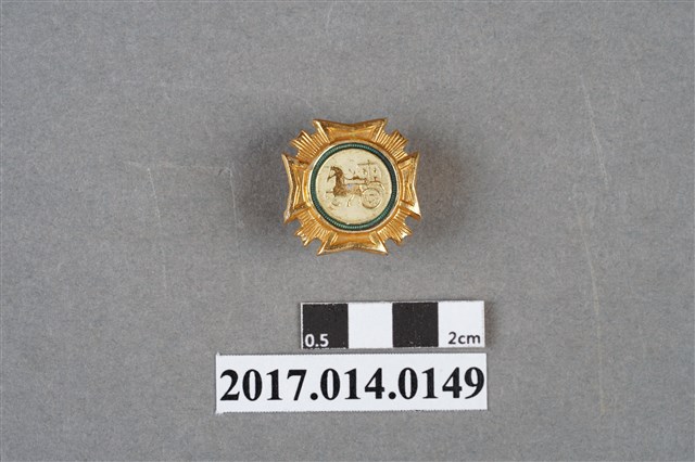 金框徽章,中央有一白底中式馬車圖案,用途不明。