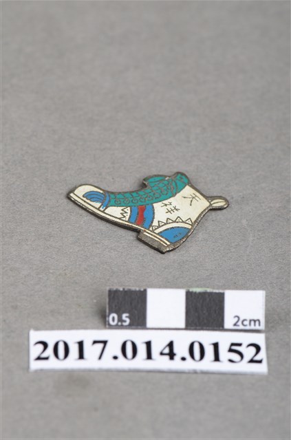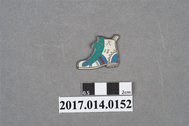 白色、藍色、綠色登山鞋形徽章,登山鞋上有「天祥」字樣,推測為登山健行之紀念章。