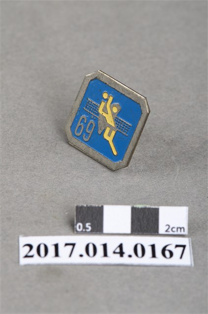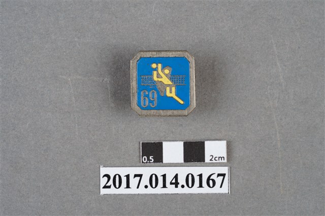 民國69年水球比賽紀念章,方形藍色徽章,中央有臺灣島、水波紋及黃色球員投球狀圖案,左下有「69」字樣。