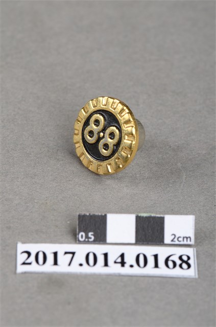 圓形黑底金邊徽章,外緣呈齒輪狀,中央有「8‧8」金色凸字。
