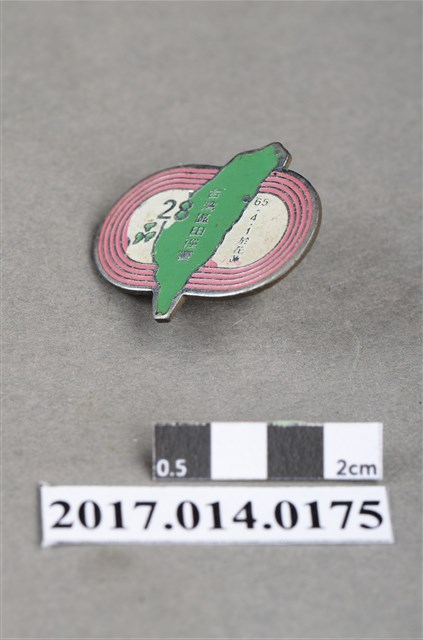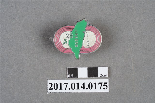 民國65年第28屆臺灣區田徑賽紀念章,徽章外型呈不規則狀,外圍為白色運動場紅色跑道圖案,中央為綠色臺灣島與澎湖三外島圖案,徽章上有「65.4.1於花蓮 臺灣區田徑賽 28」字樣。