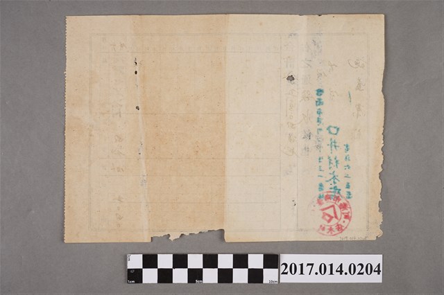 本件為昭和12年4月13日施盛源於口井材木店購買水泥之收據,為表格式收據,右側書寫4月13日購買「淺野セメント」(中譯:淺野水泥)4袋,每袋單價126,金額5040。左側書寫合計「金伍圓O四錢也」,其次為購買日期12年4月13日與顧客名施盛源。下方蓋有口井材木店之店章,包括藍色店名地址電話章(台南市港町二丁目三一番地,電話六二五番)與紅色圓形店章。
