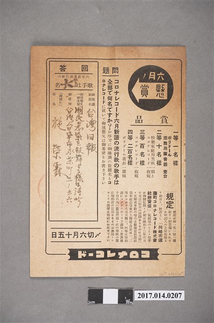 1. 本件於捐贈者祖母蔡井信件中發現,為其父施榮霖參加可樂那唱片(コロナレコ─ド)昭和12年有獎徵答劵。