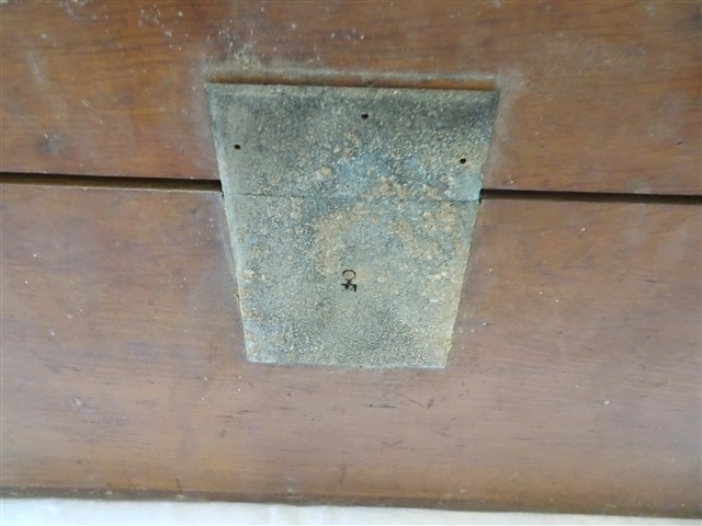 長方型黃褐色中型衣箱,表面施乾漆,以檜木木板榫卯接合而成,未使用鐵釘接合。上開式蓋,前側中央鑲嵌長方形黃銅片鎖孔,左右各有一銅屜環,方便提取。木箱外側邊緣略有凹損,內部完好,無上漆。