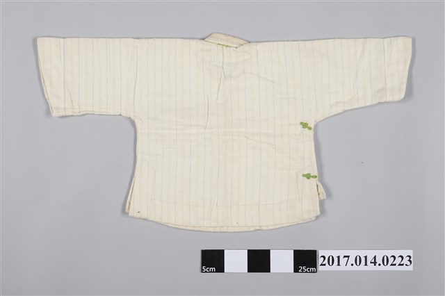 漢式長袖短衫,白色地淡藍及淡黃色條紋厚棉布質地。小立領,開右衽,草綠色盤扣。寬筒袖,袖全長97公分,衣長及腹約46.5公分,軀幹無腰身。手工加機器縫製女童秋冬服飾。