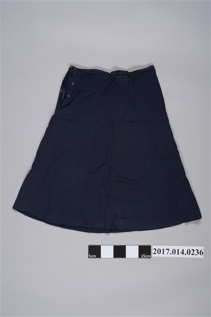 A字裙,藏青色棉布質地。腰寬約31公分,腰頭滾2公分黑色布邊。側邊開口16公分,金屬鉤及釘釦。裙襬以6片布拼縫而成,單層無內裏,襬寬72公分。裙長約62公分推測可能為女童學生及膝裙。手工加機器縫製而成。