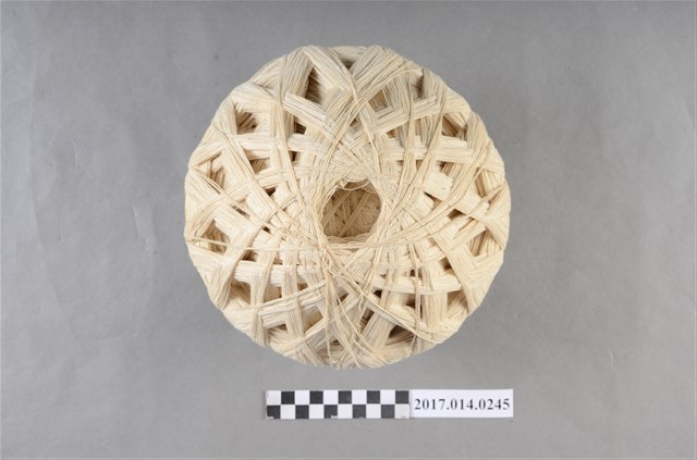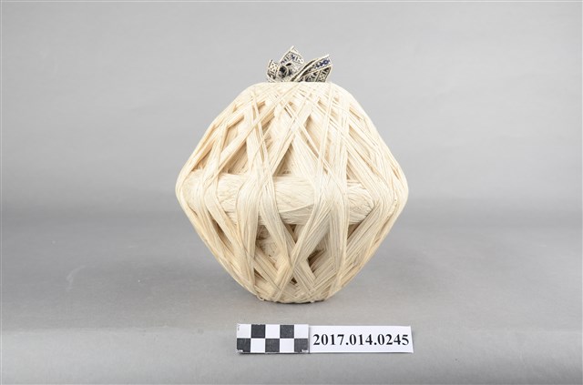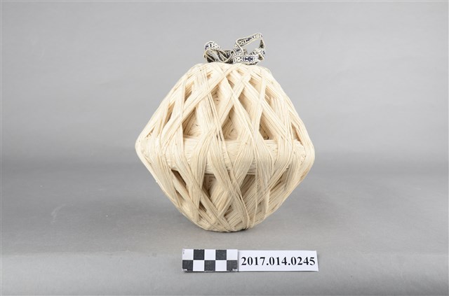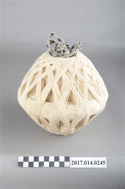 1. 本件為捐贈者於臺南市民權路3段老家衣櫃中發現之大型線球,推測為母親黃錦女士為自行縫製衣服所購買的材料。 2. 算珠型大型線球,長寬約20-25公分,米色粗棉線。