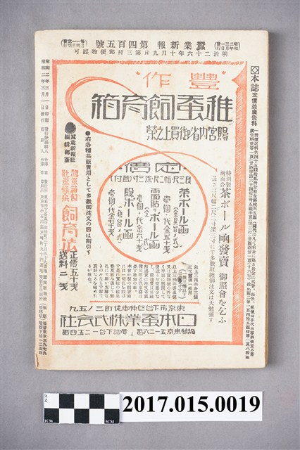 本物件為昭和二年三月發行的蠶業新報,蠶業新報內介紹:口論、社說、論說、?英、講義、經?、調查、雜錄、科學界新音、世說絹?、統計、文苑、新刊批評、新發明農蠶器具、問答、雜報,介紹各種蠶業動態與產業新知,。●京都高等蠶業學校新蠶室 ●蠶卵電氣孵化裝置●本社主催高等養蠶●大日本蠶絲會の醜聞と其革清の途…社說(297)●新蠶室の構造に就て…京都高等??學校教授 和田?太郎(300)●死卵系統を抜く方法 西川久●膿病は食下傳染をするものなりや(續) 北島?雄●大に努めよ傳統業の發展に 牧野純三●養蠶と蒟蒻栽培(承前) 上村清和●昭和二年度氣