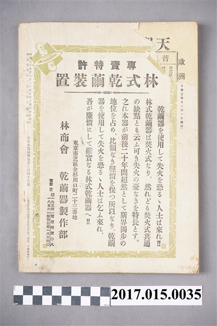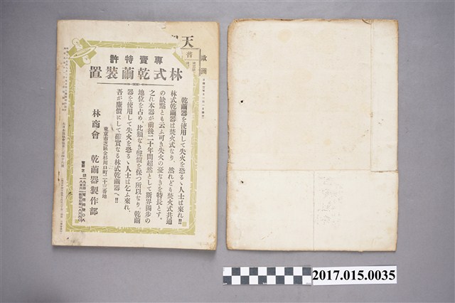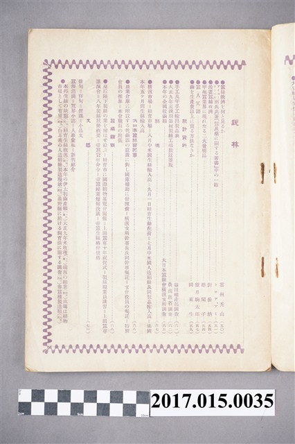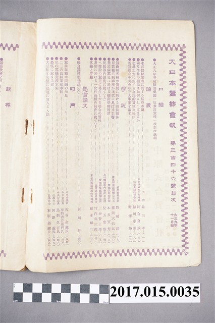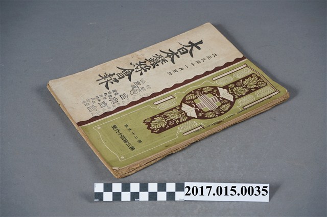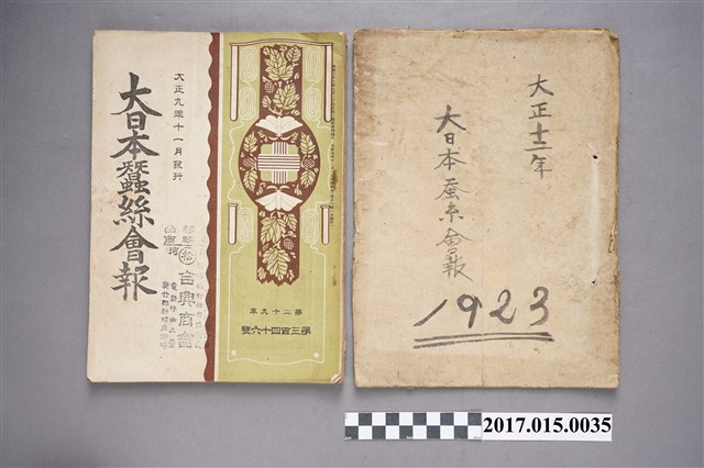 本物件為大正九年十一月發行的大日本蠶絲會報,目錄摘要:大正八年各府縣別桑園一?參?設置?一枚???/本邦蠶絲業者に対する?の??/?及生 絲の?場は何にして?まるか/製絲工女に対する?????支撐法/??場合??會の三大??を??(以下不清楚)。大日本蠶絲會在明治25年4月17日創立,其目的為求日本蠶絲業技術改良,進而推動蠶絲業的發展。而大日本蠶絲會報為其機關報。每月發行,其內容多以學者論述、相關的實驗報告統計、內外通信、大日本蠶絲會的會務報告等,與日本蠶絲業發展有關的文章。第346號內容主要介紹蠶業界產業狀況、新知,可分為口繪、論叢、學說、懸賞論