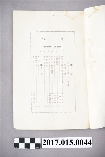 此為日治時期的雜誌,書籍頁數不多封面為黃色底,上面印有彌榮字樣底下寫著第六十七號,雜誌目錄分為口繪、本文、埋草,其中本文的部分為開校第一年の感想こ明年度に對すろ意見、群山に移り住みて、滿洲旅行偶感、滿洲の地理的觀察、或ろブラジル移民の信り、閑人閑語、彌榮往來、會計報告,並提倡大和民族的理想信仰,書本還有張於二O三高地所拍的照片,此為友部町日本國民高等學校所發行的期刊,由加藤完治所創立於大正十四年,此為後來的日本農業實踐學園,對於農業方面術有專攻,而此書刊發行於昭和二年,一年總共發行十二本,每一本售價十五錢