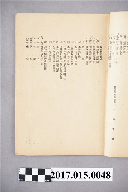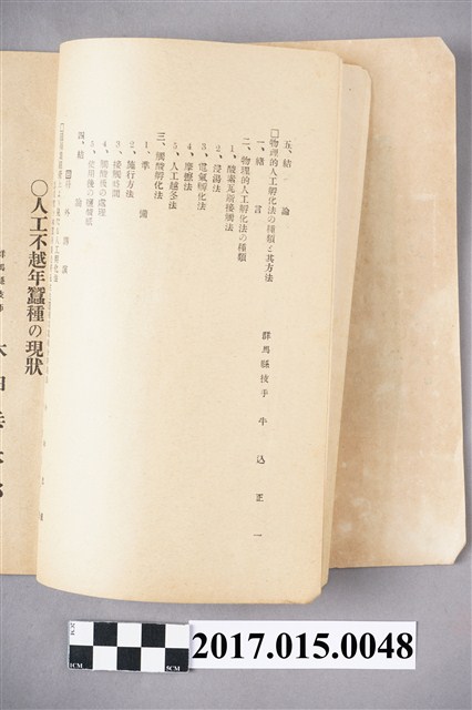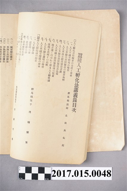 此為日治時期的書籍,上面印有「蠶種人工孵化法講義錄」,由井上蠶具製作所蠶業研究部編篡,保存狀況還算可以,只是因為歷經歲月使得書籍呈現泛黃狀,書中寫到當時蠶種人工孵化法講習會的講師名單還有科外講師,以及講習生的名單,而此講習會的會長為井上芳藏,主要透過此講習會將人工孵化的方法傳授給學生們,並進而研究更有效率的方法,此講義錄目錄分為:人工孵化蠶種飼育的現狀と將來、蠶種人工孵化法の沿革、化學的人工孵化法に就て等大標,內容相當詳細直白,使得日本蠶絲的產量更能控制,對於整個產業是有所益處的。