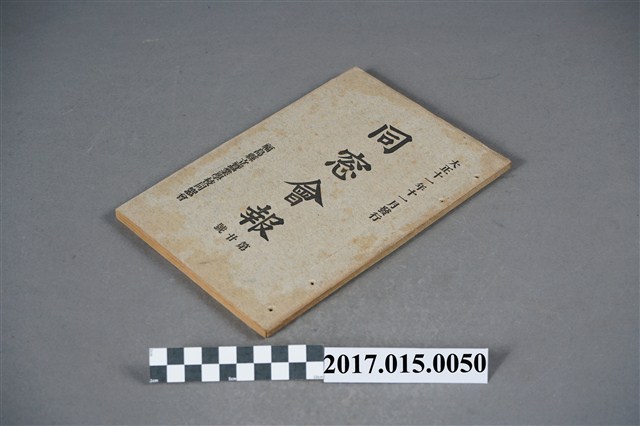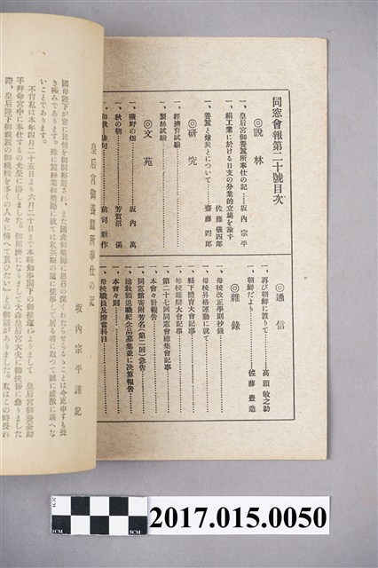 此為日治大正時期的校刊會報,上面印著同窗會報第廿號,福島縣立蠶業學校同窗會,於大正十一年十一月發行,報刊保存狀況良好只是因為年代稍久而泛黃。福島縣曾是日本本州北部重要的養蠶區,之後是因為合成纖維仿蠶絲製品盛行與中國大陸蠶業的興起,加上經濟起飛工資飛漲,使得蠶絲業成本提高逐漸失去其競爭力,蠶桑農戶開始轉作果樹或其他農作,造成蠶絲業的沒落。而此書報的目錄包含說林、研究、文苑、通信、雜錄五大標,前兩個的文章內容都著重於蠶絲業與經濟發展上頭,第三則是文章詩詞投稿為多,後兩個是有關校內一些活動紀錄或是宣傳等等。