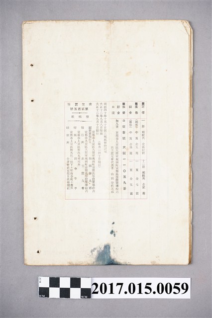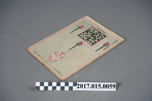 此為日治時期的書報,其頁數不多大約四十幾頁,封面上印著「衣笠蠶報」(SEPTEMBER NO.205),發行時間為大正十二年九月,由衣笠蠶友會所發行,是為京都高等蠶業學校所編寫相關內容或研發技術的紀錄等,此書屬與京都高等蠶業學校的校友會誌最早於西元1906以「衣笠蠶友會報」的名稱創刊,於西元1921改為現在的名稱,對於日本研究蠶業領域有相當大的幫助,最終於西元1940時停刊,至今依舊是蠶業學很重要的文獻資料。書刊首先校內提及為東京發生的大災害義捐的廣告,然後來是此月份的目錄為免疫學上ふり見たろ蠶病豫防法、