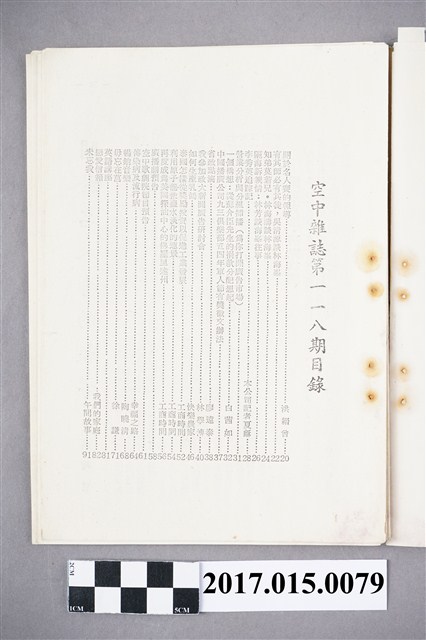 本物件為1965年9月16日發行的空中雜誌,空中雜誌前身為中國廣播公司《中廣週刊》,於1961年12月31日改版為<空中雜誌>,改版前期為雙週刊發行,後於1966年1月1日恢復為單週刊。118期/中華民國五十四年九月十六號出版/關於名人賽的報導/洪縉曾/有其師必有其徒,吳清源潭林海?/知弟莫若兄.林海濤潭林海?/隔海訴親情:林芳談海?往事/李秀英追蹤記/一個構想:從蘇介臣先生的捐款分配想起/泰國怎樣從獎勵投資以促進工業發展/利用原子能使鹽水淡化的遠景/再度成為美國探油井中心的佛羅裡達州/空中歌劇院節目預告/九三俱樂部主持徐謙/