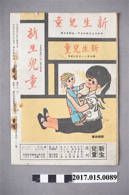 臺灣新生報附送的「新生兒童」週刊,1960年12月24日創刊,目前已停刊,是當時小學生少有的課外閱讀刊物。常刊載科學常識與經典故事,本刊特色為每一期封面都有請漫畫家創作、由各地學童提字,內頁部分則也會刊登多頁漫畫與插畫,是為台灣漫畫家重要的推手刊物,包括以大嬸婆漫畫出名的劉興欽老師的"小聰明"、台灣早期知名漫畫家牛哥老師的"小牛"、兔寶寶漫畫等,同時也提供專欄向各地國校學童們徵稿。新生報兒童週刊第109期/民國五十二年一月十九日/定價五角/兔寶寶插圖/紅氣球/宋雯/毛頭插畫/小鳳/母雞/中山國校胡樂耕/小文壇/雨/靜心小學譚延辛/小小畫展/國語實小顏芷霖/新竹西門國校黃露露/台中力行國校建成/竹小葉克平/再興小學林靜國/小聰明插畫/劉興欽/