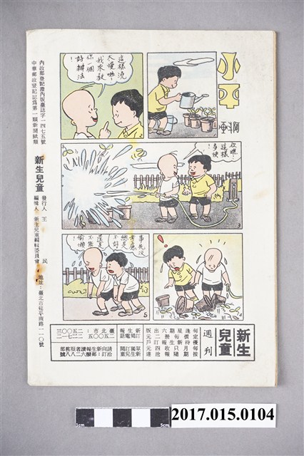 臺灣新生報附送的「新生兒童」週刊,1960年12月24日創刊,目前已停刊,是當時小學生少有的課外閱讀刊物。常刊載科學常識與經典故事,本刊特色為每一期封面都有請漫畫家創作、由各地學童提字,內頁部分則也會刊登多頁漫畫與插畫,是為台灣漫畫家重要的推手刊物,包括以大嬸婆漫畫出名的劉興欽老師的"小聰明"、台灣早期知名漫畫家牛哥老師的"小牛"、兔寶寶漫畫等,同時也提供專欄向各地國校學童們徵稿。新生報兒童週刊第175期/民國五十三年四月二十五日/定價二元/兔寶寶/阿強幻芙畫/小平阿斗畫/小聰明劉興欽小小畫展/綠孩子探險