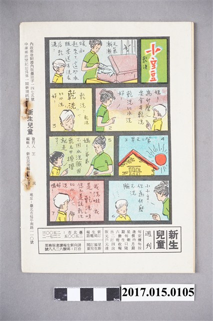臺灣新生報附送的「新生兒童」週刊,1960年12月24日創刊,目前已停刊,是當時小學生少有的課外閱讀刊物。常刊載科學常識與經典故事,本刊特色為每一期封面都有請漫畫家創作、由各地學童提字,內頁部分則也會刊登多頁漫畫與插畫,是為台灣漫畫家重要的推手刊物,包括以大嬸婆漫畫出名的劉興欽老師的"小聰明"、台灣早期知名漫畫家牛哥老師的"小牛"、兔寶寶漫畫等,同時也提供專欄向各地國校學童們徵稿。新生報兒童週刊第176期/民國五十三年五月二日/定價二元/小豆豆乾洗/綠孩子探險嚴友梅/兔寶寶/名人故事二則鄭仰貴/放學回家的
