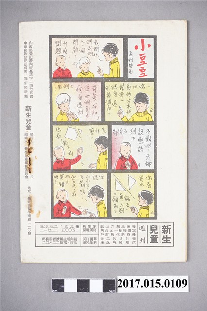 臺灣新生報附送的「新生兒童」週刊,1960年12月24日創刊,目前已停刊,是當時小學生少有的課外閱讀刊物。常刊載科學常識與經典故事,本刊特色為每一期封面都有請漫畫家創作、由各地學童提字,內頁部分則也會刊登多頁漫畫與插畫,是為台灣漫畫家重要的推手刊物,包括以大嬸婆漫畫出名的劉興欽老師的"小聰明"、台灣早期知名漫畫家牛哥老師的"小牛"、兔寶寶漫畫等,同時也提供專欄向各地國校學童們徵稿。新生報兒童週刊第164期/民國五十三年二月八日/定價二元/小豆豆/兔寶寶/綠孩子探險嚴友梅/花瓶朱文輝/科學世界/大人物的小故