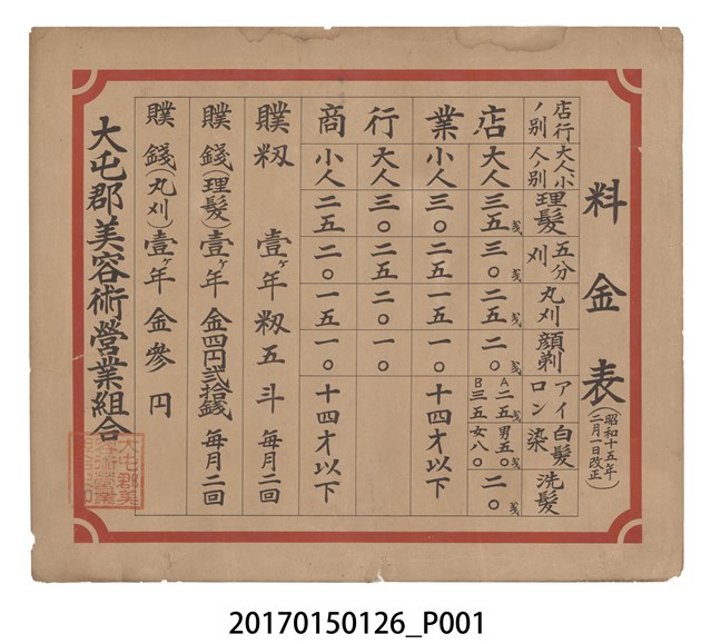 日治時期,組成營業組合來規範商業經營定價的準則,本「大屯郡美容術營業組合」規範店業與行商理髮、五分刈、丸刈、顏剃、ア亻ロン、白髮染、洗髮等不同營業項目的定價,另還分大人與小人的售價,以此規範商家。