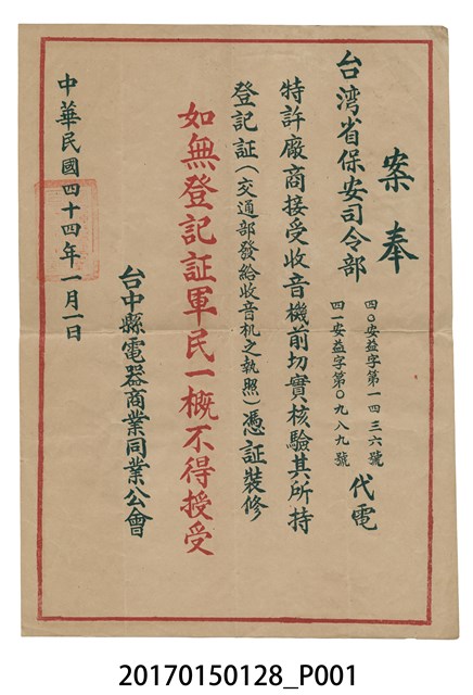 本物件為民國44年的「臺中縣電器商業同業公會收音機憑證裝修聲明公告」,此由「台中縣電器商業同業公會」轉發「台灣省保安司令部」之發文,內容為「特許廠商接受收音機前切實核驗其所持登記證(交通部發給收音機之執照)憑證裝修,如無登記證軍民一概不得授收」,1955年正值政府頒布動員戡亂時期臨時條款,因此收音機設備的設置須受到「無線電器材廣播收音機管制辦法」規定,需有登記證才能裝設。