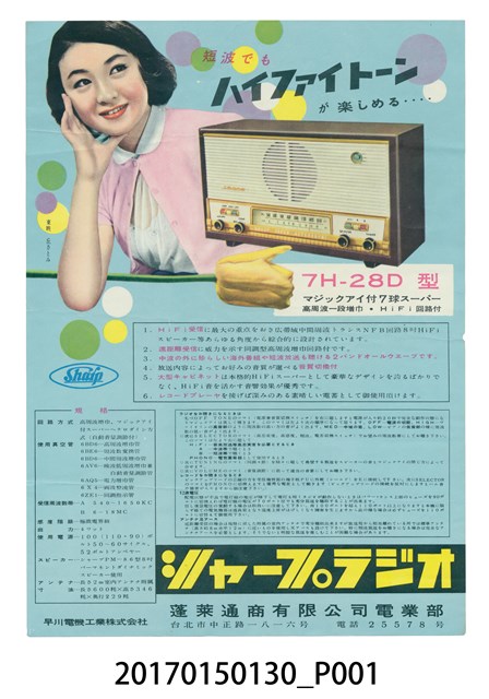 從1920年代開始,收音機漸漸變成家庭娛樂中心。直到1930年代晚期電視出現之前,收音機一直有至高無上的地位,被認為是主要的傳播工具。1930年代,臺灣放送協會成立,分別在臺北、臺中、臺南成立支局,臺北放送臺即今二二八和平公園的台北市二二八紀念館,按月收取放送會費。臺灣島內可透過廣播在短時間內接收訊息,成為台灣總督府用來普及日語、推行皇民化增進人民認同的工具之一。光復後,臺北放送台改成臺灣廣播公司,國民政府遷台,改為中國廣播公司。戰後因戒嚴條款,購買收音機,需有無線電通信執照,聽廣播則要有電視廣播接收機執照。本廣告物件應為夏普所出產的收音機,夏普早年稱為早川電機工業,1925年開始以夏普開始販售礦石收音機,礦石收音機成為夏普戰前的主力商品。