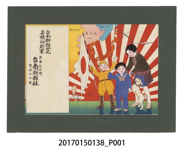 《台南新報》1899年由日本人富地近思創立於現今臺南府城地區,原名《台澎日報》。1903年擴充資金後,始改名《台南新報》,與《台灣日日新報》、《台灣新聞》並稱為日治時期台灣三大官報。《台南新報》內容涉及不同社會層面,除官方的法令規章與島內外重大新聞外,還大量刊載宗教、民俗、音樂、戲曲、遊藝等活動,由於屬於地方報紙亦對臺南州轄下的社會、生活留下珍貴的記錄,為研究日治時期台灣社會面貌與庶民生活最具價值的史料之一。1925年為快速傳達訊息,爭取廣大讀者,一方面增刊晚刊,一方面先後於島內各大城市及日本東京、大阪設立支局。1937年4月臺灣漸受戰爭影響日本當局下令所有報刊停止漢文欄,《台南新報》更名為《台灣日報》。1944年3月又與《台灣日日新報》、《台灣新聞》、《興南新聞》、《東台灣新報》、《高雄新報》等日報同遭廢刊,而後齊併為《台灣新報》刊行。 本件圖面以太陽旗及地圖為底,畫面中小孩著軍裝及水手服,推測應為受戰爭影響所有的廣告,強化人民一體的概念,臺南新報1937年4月即改名,最晚應為1937年的廣告。