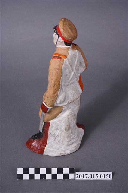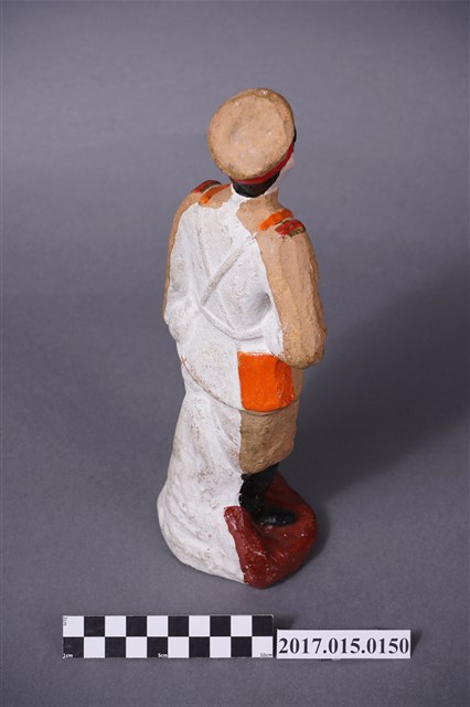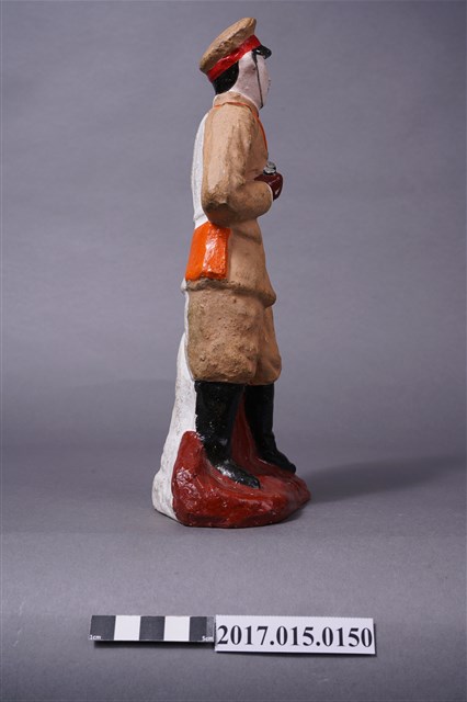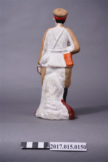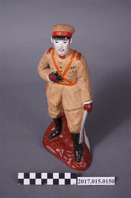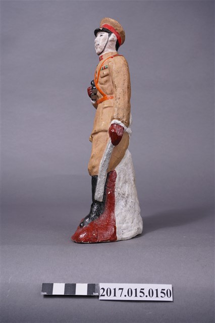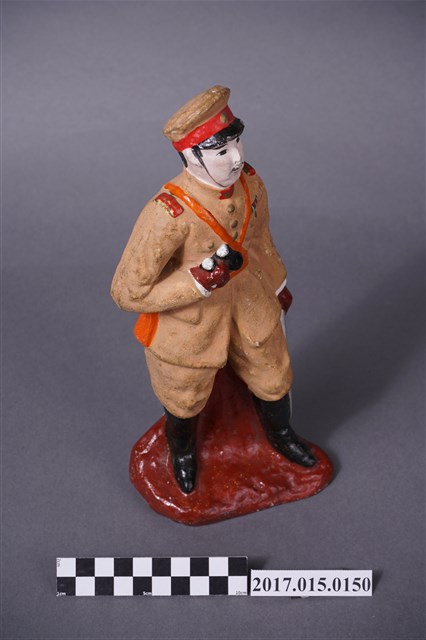 本件以陶塑捏成日本軍官,應為戰爭時期下的產物,藉由這些圖像的宣導使後方民眾塑造國家的一體感,以達成國家精神總動員運動,喚起全民備戰情緒與愛國情操。根據研究日本戰爭時期曾在文宣設計上加入戰爭、戰場、戰士等相關圖像,用以作為戰時宣傳與精神統戰之工具。因而,這些官方宣傳媒體大多作戰爭相關主題的設計,甚至一般民間生活中的各種美術設計,亦在戰爭氛圍中呼應時勢作戰爭色彩的表現。 當時常用作為戰時宣傳之設計主題包括有:國家軍威的展現與宣傳、戰時政令的宣達與推行、戰時官方活動舉辦的宣傳、戰線後方備戰的宣導。表現上應用的圖像則有包括有英勇戰士、作戰武器、日本帝國旗幟,戰爭隱喻圖像等各種視覺符號。