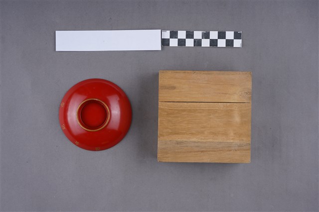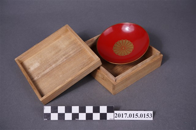 臺灣早期移民多來自福建,當時民間所有的漆器大多是傳統的精緻漆器,由交易或唐山師傅來台製作且多應用於生活中的習俗或宗教用品,日本時代後,由於日本人的生活與漆器密不可分,因此有計畫的在臺培植漆工事業,引進漆樹、製作推廣漆器,設立工藝傳習所使臺灣漆器在日本時代開始發展,甚至出現具有臺灣特色的蓬萊塗。漆器上的紋章應為皇室的菊花紋,全稱為十六瓣八重表菊紋,主要為皇室用的紋章,同樣可代表日本國,本件外盒寫有國會兩字,需再確認時期,日本之國會適用1889年發布《大日本帝國憲法》到1947年發布《日本國憲法》期間的國會名稱其全稱應為帝國議會(1890年11月29日~1947年3月31日),因此國會的簡稱通常指1947年後的日本國國會而非帝國議會(有一說當時略稱應為議會),1947年以前是否以國會稱之需在商確。且不論是帝國議會或是日本國國會所使用的紋章應為被稱為太閣桐的五七桐紋,是否會使用皇室或擴大解釋為整個日本的紋章做為禮物餽贈。