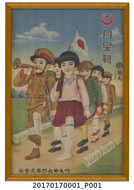 本文件為月星靴廣告,年代約於1930前後,為當時臺北市榮町菊元百貨張貼之彩色海報。圖中可見數名學童穿著月星牌的西式皮靴,舉日本旗列隊行走於陸上。日本知名童鞋品牌『MoonStar月星』前身為『つちやたび』,由倉田雲平於1873年創立,起初以訂製鞋鋪起家,後因支援製造西南戰爭薩摩軍之軍需品(軍服與軍旗等)事業逐步起色,並成為日本業界採用德製裁縫機生產的第一人。1899年日本國內頒布赤足禁令,使得社會對足袋(傳統分趾襪)的需求急速上升,機械化產線的推行,順勢登上當時足袋業霸主。到了1920年橡膠製品的流行,傳統的足袋也首次在底部加上橡膠鞋底,不久後便改良成現代化的布鞋運動鞋等,並對海外殖民地進行輸出,推出適合當地的支那靴、朝鮮靴等。1928年全面採用以彎月與星星作為統一商標,至今成為眾所皆知的商標。然而於第二次世界大戰後,雖然月星企業受到重創,但還是仍然積極向國內與國外宣傳,也積極投資製鞋底原料的橡膠事業,1970年還於臺灣、韓國成立橡膠、化學公司等,至今成為世界知名的製鞋企業。