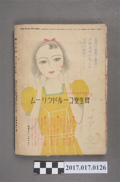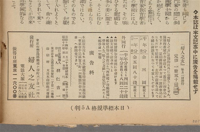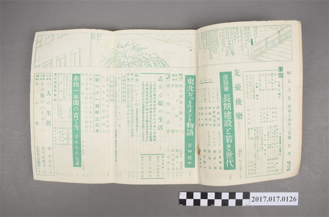 1.本文件為昭和14年(1939)3月1日婦人之友社發行之《婦人之友》第33卷第3號,目錄中有幾個章節,分別是:座談會─長期建設と若き世代、東北セッルメント物語、赤坊一年間の育て方,並穿插著牙膏、廚房用具、藥膏、奶瓶…等各式廣告。當時的價格為一冊50錢,如需購買須至婦人之友社的特約商店,或以劃撥方式訂購,半年分6冊需金3圓,一年分12冊需金5圓80錢。封底為資生堂的化妝品廣告,訴求透過日本進步的科學生產,化妝品可以達到強化皮膚潤澤的功效。
