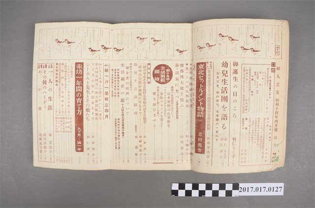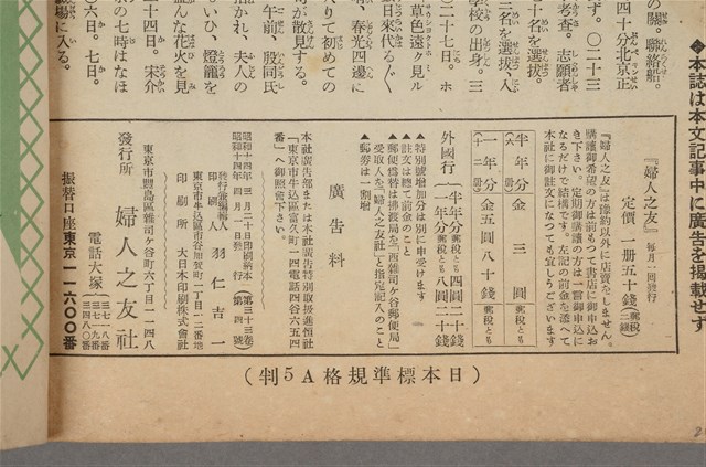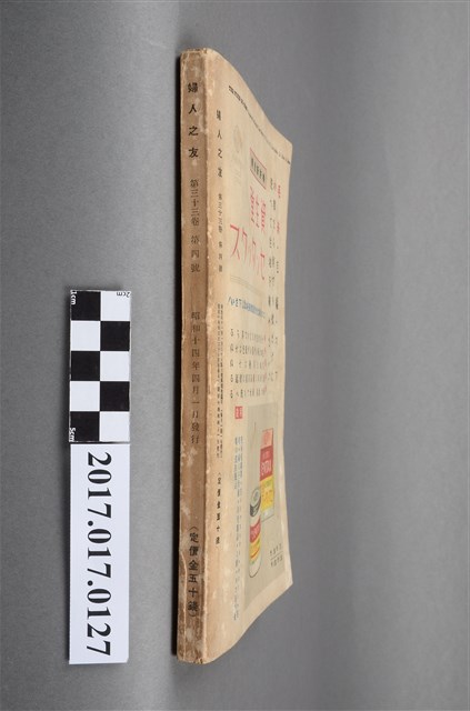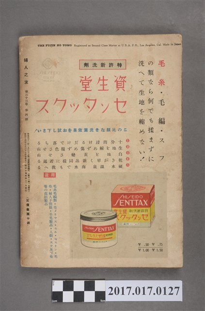 1.此為昭和14年(1939)4月1日婦人之友社發行之《婦人之友》第33卷第4號,目錄中有幾個章節,分別是:幼兒生活團を語る、東北セッルメント物語、赤坊一年間の育て方,並穿插著婦女病用藥、廚房用具、近視治療…等各式廣告。當時的價格為一冊50錢,如需購買須至婦人之友社的特約商店,或以劃撥方式訂購,半年分6冊需金3圓,一年分12冊需金5圓80錢。封底為資生堂特許新洗劑的廣告,訴求透過日本的最新科技,可以使婦人方便清洗羊毛製品、毛編類布料或各種布料。