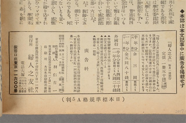1.本文件為昭和十四年(1939)四月一日婦人之友社發行之《婦人之友》第33卷第5號,目錄中有幾個章節,分別是:座談會─不良少女的問題、座談會─生活的規格化、生活刷新圖繪,並穿插著各類食譜以及婦女病用藥、唱片、洗衣精…等各式廣告。當時的價格為一冊五十錢,如需購買須至婦人之友社的特約商店,或以劃撥方式訂購,半年分六冊需金三圓,一年分十二冊需金五圓八十錢。封底為資生堂石鹼的廣告,訴求透過日本的最新科技添加了加強滲透性的原料與海產動物油,可以在洗潔身體時搓出大量泡沫,達到洗淨效果。