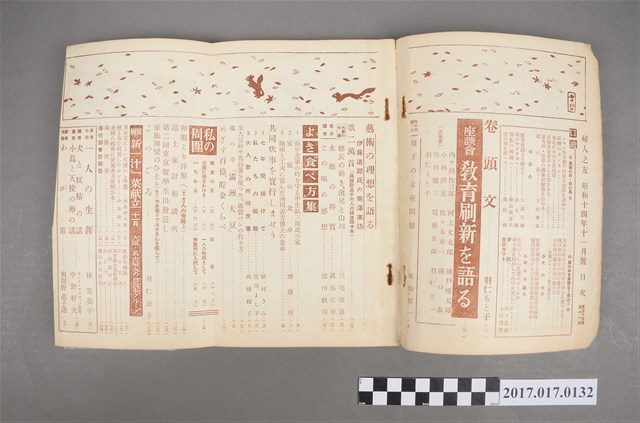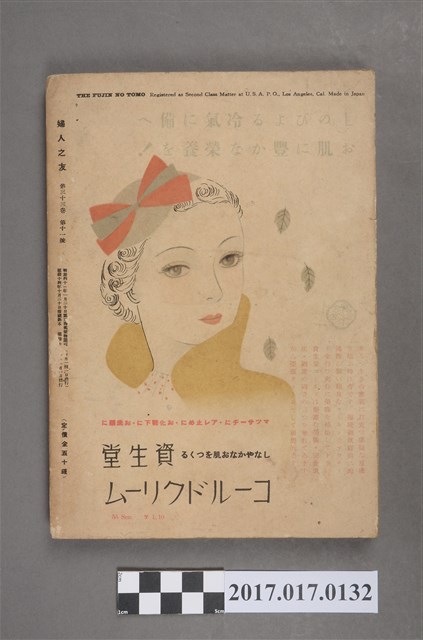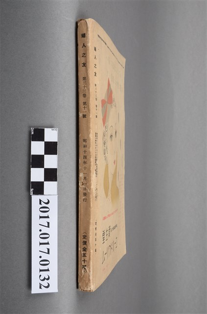 1.本文件為昭和14年(1939)11月1日婦人之友社發行之《婦人之友》第33卷第11號,目錄中有幾個章節,分別是:座談會─教育刷新を語る、藝術の理想を語る、よき“食べ方”集、私の周圍,內容提及滿州國的生活狀況、以及當時的食糧問題,並穿插著各類食譜以及婦女用化妝品、服飾、理研グィタミン、洗衣精…等各式廣告。當時的價格為一冊50錢,如需購買須至婦人之友社的特約商店,或以劃撥方式訂購,半年分6冊需金3圓,一年分12冊需金5圓80錢。封底為資生堂的化妝品廣告,訴求透過日本進步的科學生產,化妝品可以達到強化皮膚潤澤的功效。