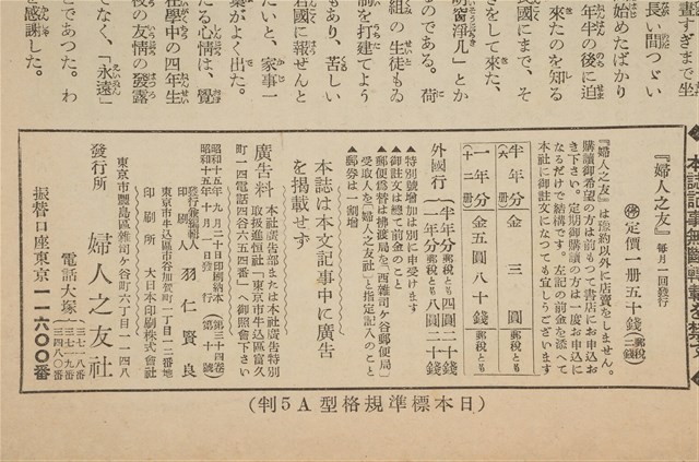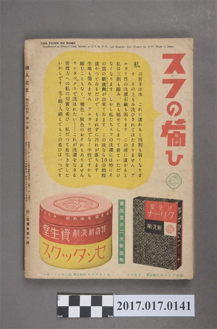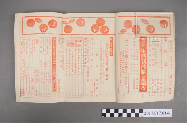 1.本文件為昭和15年(1940)10月1日婦人之友社發行之《婦人之友》第34卷第10號,目錄中有幾個章節,分別是:座談會─生活新體制を語る、少い材料た豐富に生かした經濟的な家庭料理,內容提及新的體制和思想、健康研究、宇宙研究以及當時的經濟狀況,並穿插著各類食譜以及婦女用化妝品、理研グィタミン、洗潔劑…等各式廣告。當時的價格為一冊50錢,如需購買須至婦人之友社的特約商店,或以劃撥方式訂購,半年分6冊需金3圓,一年分12冊需金5圓80錢。封底為資生堂特許新洗劑的廣告,訴求透過日本的最新科技,可以使婦人方便清洗羊毛製品、毛編類布料或各種布料。