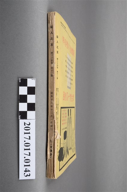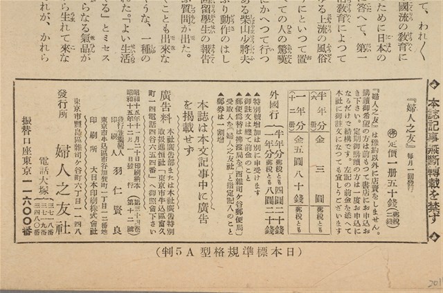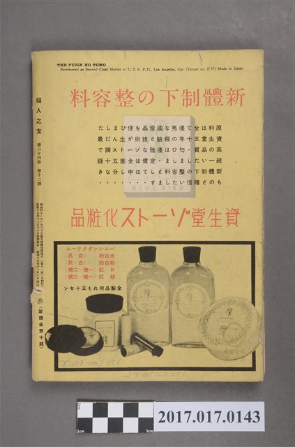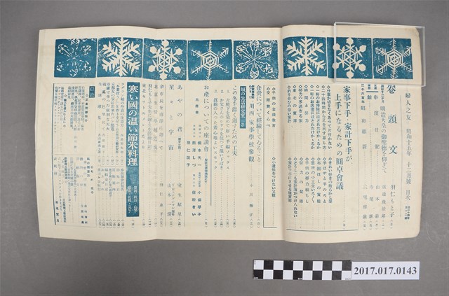 1.本物件為昭和15年(1940)12月1日婦人之友社發行之《婦人之友》第34卷第12號,目錄中有幾個章節,分別是:家事下手‧家計下手が上手にるための圓卓會議、寒い國の溫い節米料理…等,內容提及新的體制和思想、昭和維新、家事研究、孩子的教育以及當時的經濟狀況,並穿插著各類食譜以及婦女用化妝品、理研グィタミン、髮油、洗潔劑…等各式廣告。當時的價格為一冊五十錢,如需購買須至婦人之友社的特約商店,或以劃撥方式訂購,半年分6冊需金3圓,一年分12冊需金5圓80錢。封底為資生堂的化妝品廣告,並標榜純國產,訴求透過日本進步的科學生產,化妝品可以達到強化皮膚潤澤、美白的功效。