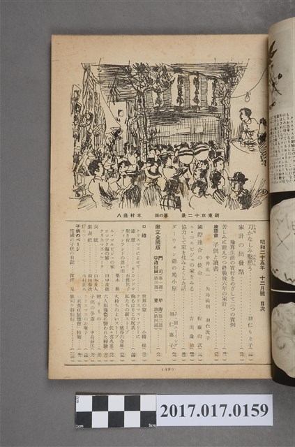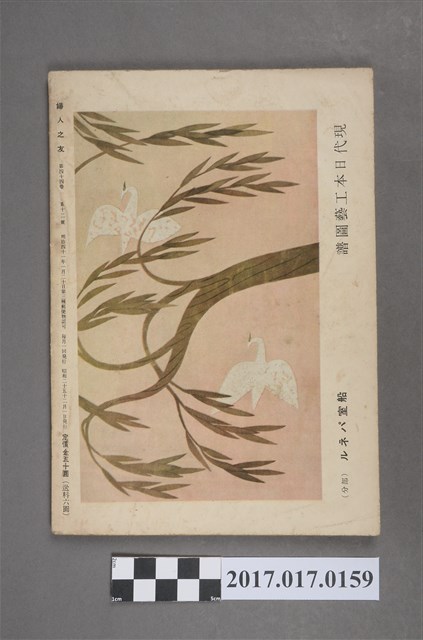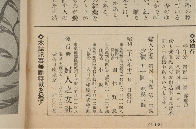 本物件為婦人之友社發行之《婦人之友》第44卷第12號,內容為:刀かなし鑿愁う/羽仁とも子、家計の出發點、苦しみに耐えつつ終戦後六年の家計、座談會 子供と讀書、國際連合の使命/佐藤尚武、ル・コルビジェの家を見る/吉川逸治、協力して家を住みよくした話、ダーウュン爺の鳩小屋/J.H.ユーイング羽仁惠子、獻立全國版 門司甲府宇治山田東京、口繪、子供のページ、雜司ヶ谷短信。日本大正末期至昭和初期,由於關東大地震連帶使社會不景氣,出版社開始流行出版円本(類似專題書籍,常見命名為xx全集稱之)與文庫書(以A6為尺寸的書),除了一般書籍的編印外,為了及時反映社會訊息雜誌遂逐漸流行,譬如1932年日本圖謀建立滿州國時,日本國內就出現許多評論當時中國大陸的相關消息,1937年由於蘆溝橋事變,日本為了確保軍事物資,遂進行經濟統制,日本出版界便以情報宣傳機關管理國家力量開始介入,1938年甚至公告兒童雜誌字數限制、附錄廢止等政策,隨著戰事緊張,一些較無戰爭宣傳的雜誌被統合廢止,兒童或婦人雜誌也無法倖免,戰後,雜誌出版才得以逐一恢復。婦人之友社創立於1903年前身為『家庭の友』,創辦人為羽仁もと子與羽仁吉一,創刊目的基於基督教信仰如何向民眾傳達及經營理想家庭,而今(2015)仍持續發行。
